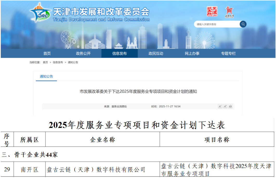 近日,根據(jù)《市發(fā)展改革委關(guān)于下達(dá)2025年度服務(wù)業(yè)專項項目和資金計劃的通知》盤古云鏈(天津)數(shù)字科技有限公司成功獲天津市服務(wù)業(yè)專項資金支持。
